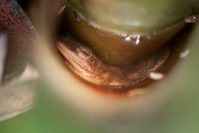 I couldn’t resist posting today, even briefly, and especially to show this cute little Cuban Tree Frog (Osteopilus septentrionalis) I discovered sleeping between the water-filled leaves of a bromeliad. It was actually underwater in this shot. It opened its eyes a bit with the light, so it was alive.