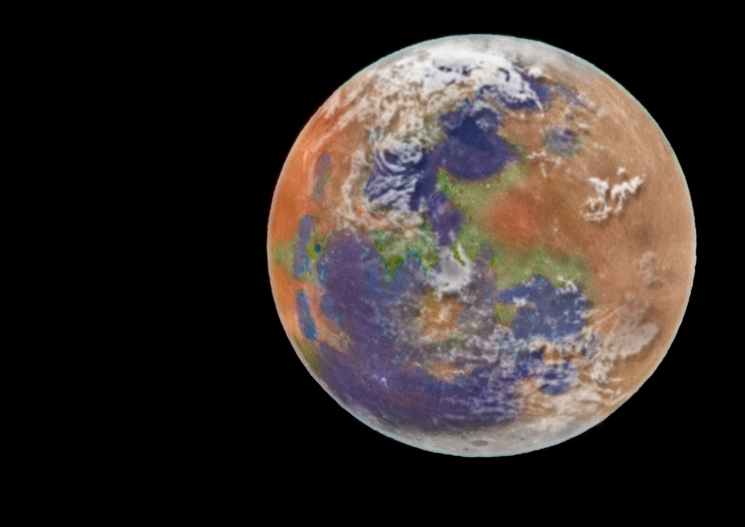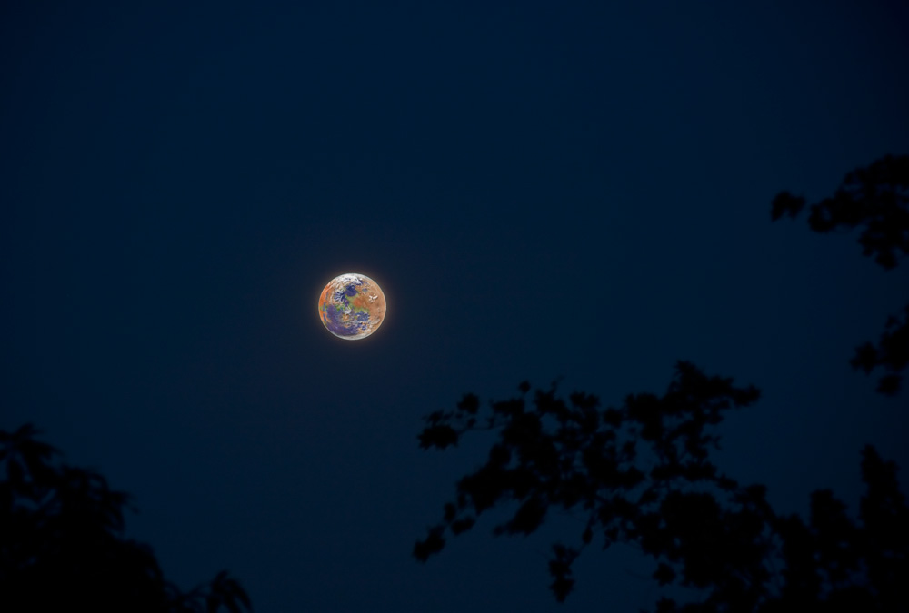 This lunar fascination appeared again in the recent “super moon,” a full moon at its perigee. I took pics of the super moon. I then started thinking, what if the moon were massive enough to hold on to an atmosphere, and it was able to nurture life, like Earth? What if the craters were filled with oceans, and the higher elevations cold and icy?