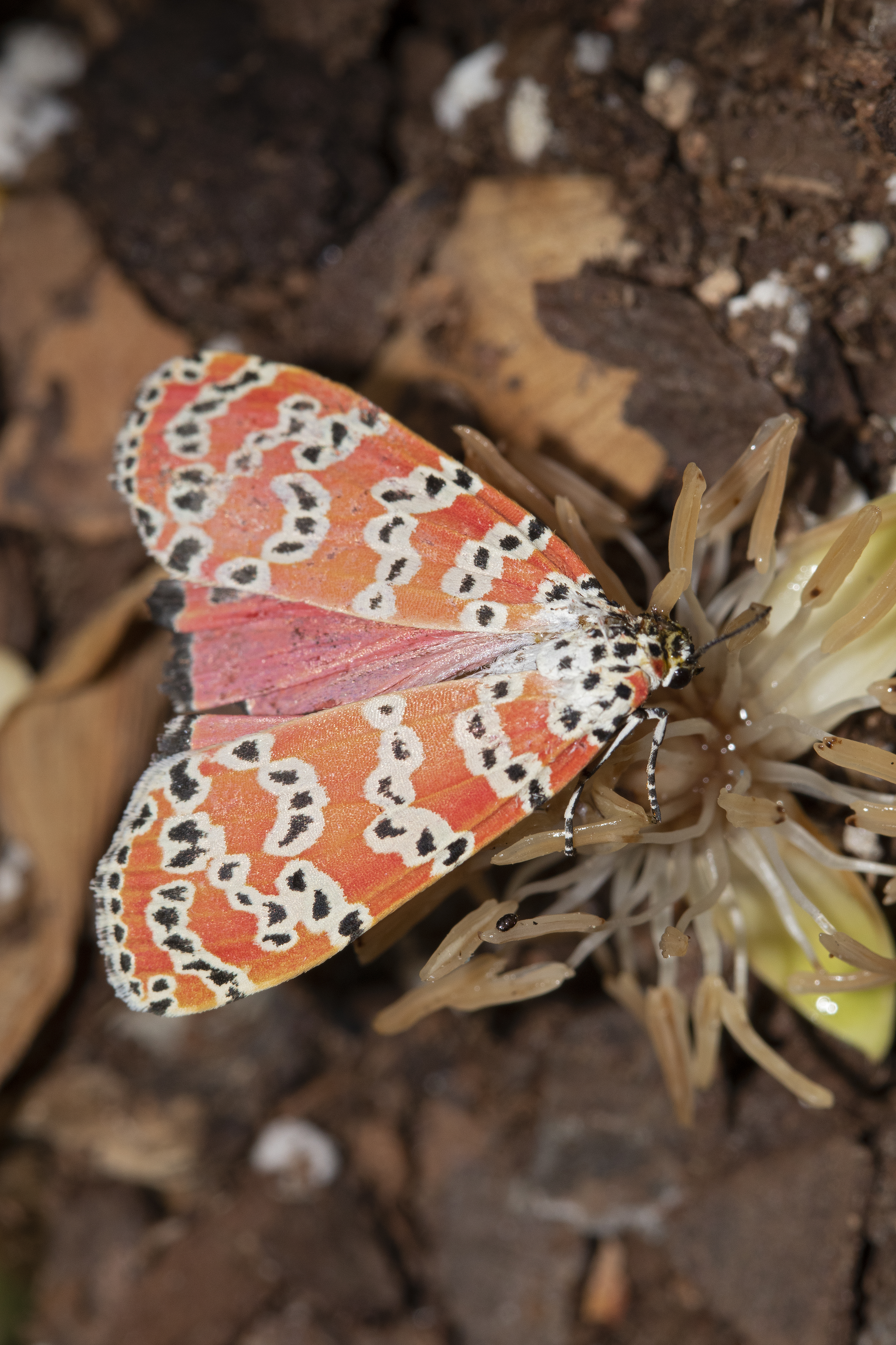 I present the bella moth, also called the rattlebox moth (Utetheisa ornatrix), an unusual diurnal moth.